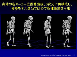 たとえば、被験者の身体の関節の回転中心付近の複数の箇所に、遠赤外光を高効率で反射するマーカーを装着させ、複数のカメラでその反射光を捕らえて得られたデータを3次元に再構成して骨格モデルに当てはめ、各種運動を再現する装置、脳の血流変化を近赤外光を用いて計測する脳機能測定装置、膝屈伸の筋力測定等のための圧測定装置、眼球運動測定装置等があります。これらの装置から得られた各種データは、訓練や福祉機器の開発等に役立てられています。